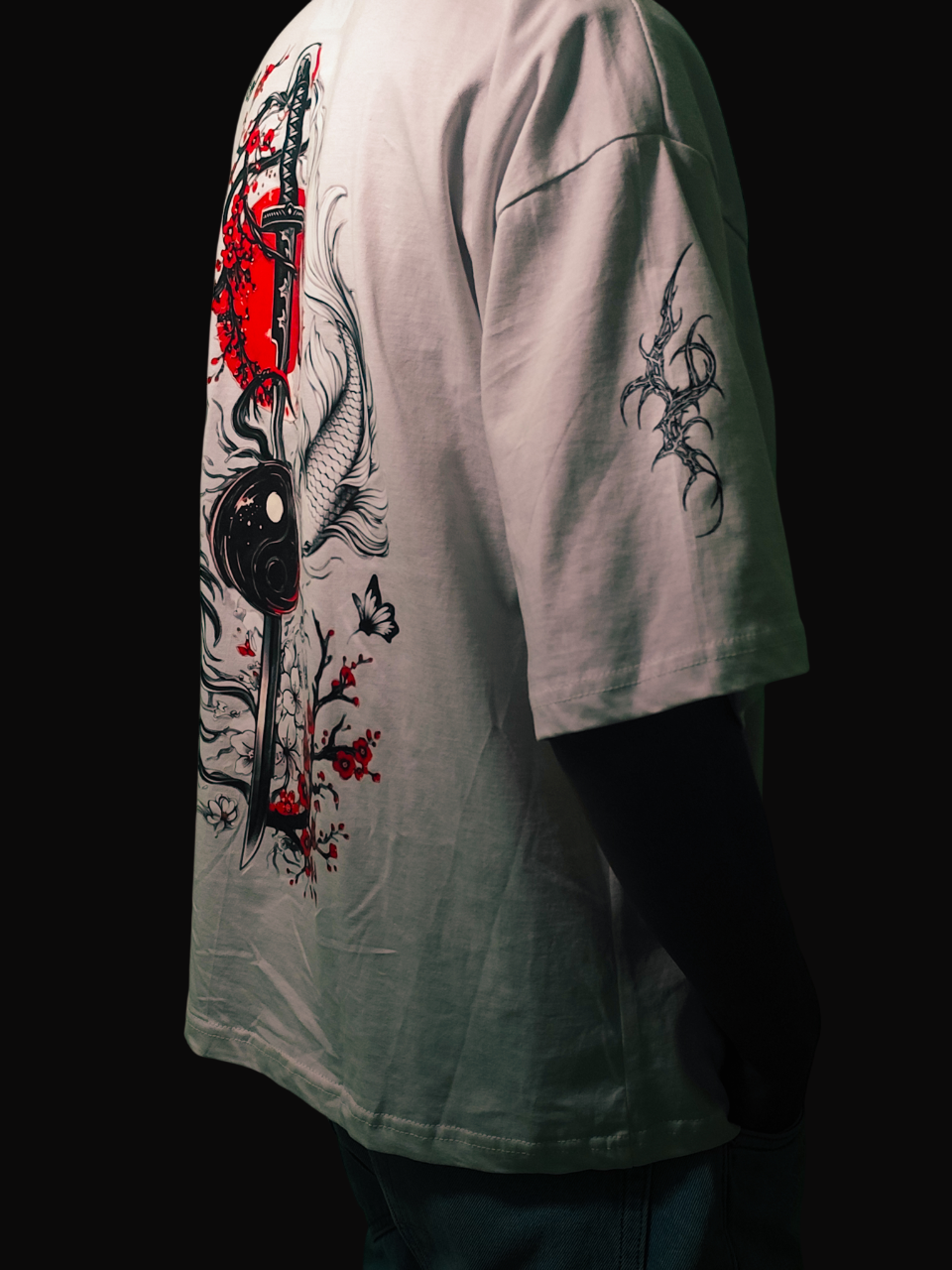 At the heart of the design lies a katana piercing through a yin-yang guard, symbolizing balance between chaos and control. Surrounding elements like the koi fish, flowing dragon energy, cherry blossoms, and butterflies represent strength, transformation, and rebirth. The striking contrast of deep blacks and fiery reds against a clean white base makes this tee impossible to ignore.